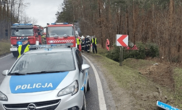 W samochodzie, który uderzył w drzewo i dachował, strażacy znaleźli nieprzytomną osobę. Około 35-letni mężczyzna był zakleszczony w pojeździe, dodatkowo samochód przygniatało złamane drzewo – przekazał st. kpt. Marcin Bajur, oficer prasowy KW PSP w Kielcach.